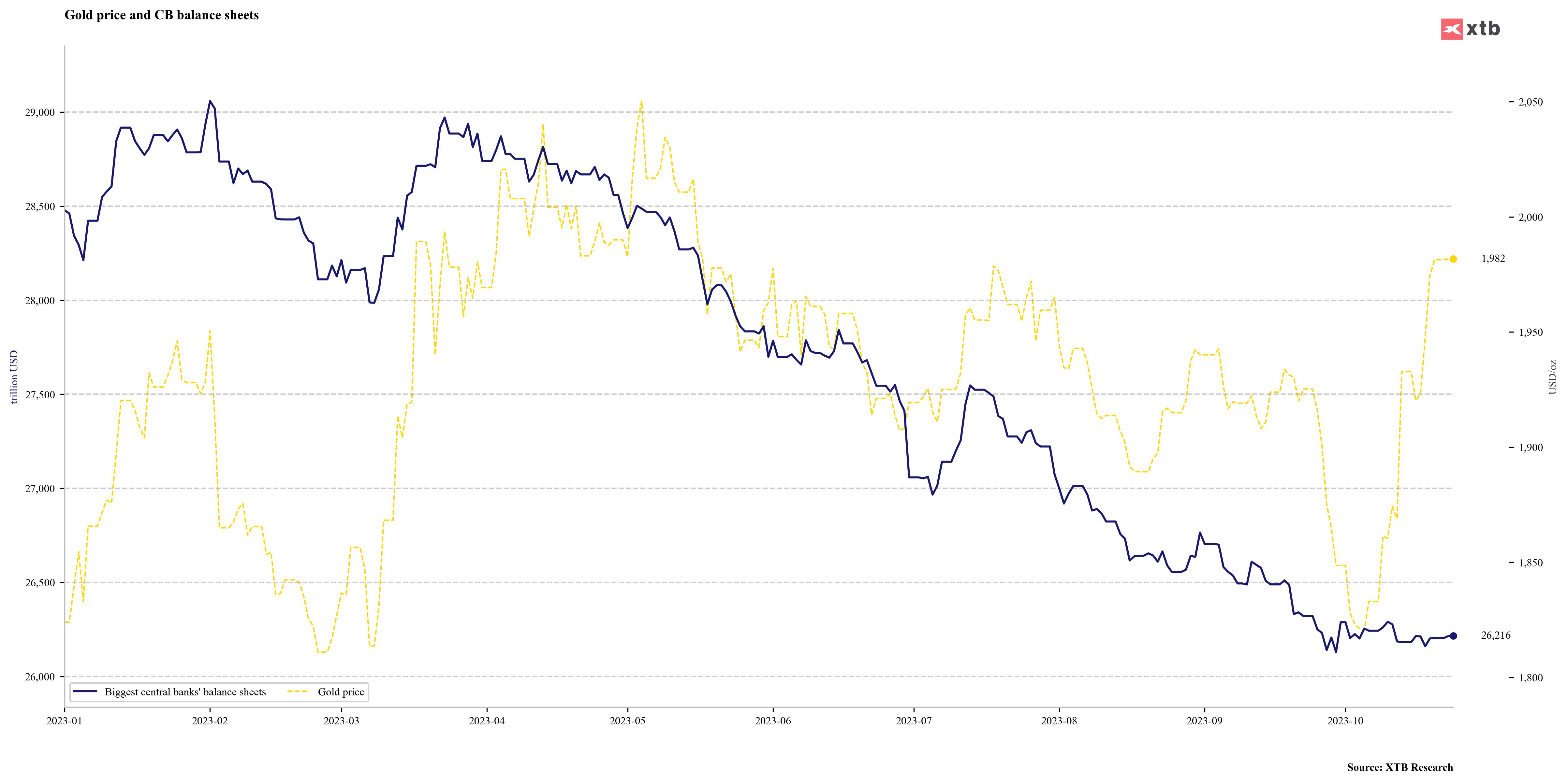 L'or continue de se négocier à des niveaux élevés par rapport aux bilans des principales banques centrales. Source: Bloomberg Finance LP, XTB