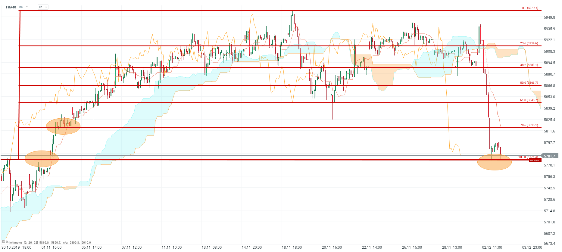 Le CAC40 est venu chercher sa zone de support majeure à 5 776.5 points avant de rebondir. La tendance de fonds reste haussière, cependant afin de confirmer un retour à la hausse des cours, l’indice devra s’affranchir de la zone des 78.6 % des retracements de Fibonnaci (5.815 points) comme ce fut le cas début novembre.