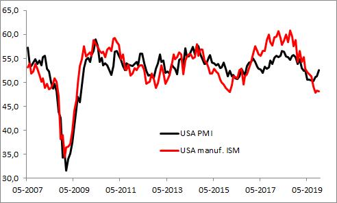 Les marchés ont surtout réagi à la forte divergence des enquêtes PMI du secteur manufacturier américain. En effet, selon IHS Markit, le secteur manufacturier américain est en expansion est a atteint un plus haut de 7 mois, ceci grâce à une expansion plus rapide de la production et des nouvelles commandes. En revanche c’est une lecture tout à fait contradictoire qui fut livrée par l’Institute for Supply Management : 4ème mois consécutif de contraction du secteur, contraction des nouvelles commandes, contraction des exportations et de la consommation.