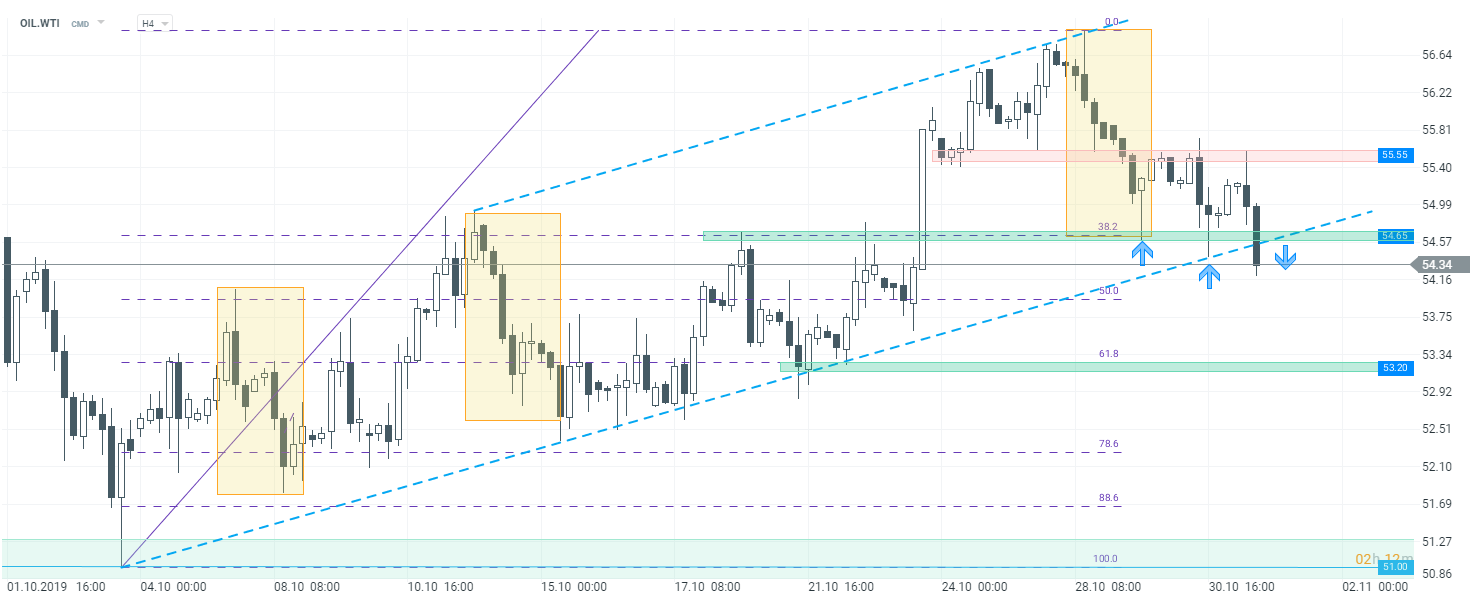 Au début de la séance d'aujourd'hui, le pétrole était à la hausse, mais des vendeurs sont apparus sur le marché lorsque Bloomberg a annoncé que les autorités chinoises doutaient qu'un accord commercial à long terme avec Donald Trump soit possible. Le prix du pétrole a chuté rapidement après la publication du rapport et se situe maintenant au-dessous de la zone de soutien clé. La zone verte sur le graphique ci-dessous est marquée avec la limite inférieure de la structure d’overbalance, les sommets récents et le retracement de 38,2% de Fibonacci. Les acheteurs ont réussi à arrêter la baisse à deux reprises, mais le support a cédé à la troisième tentative. Une cassure en dessous pourrait entrainer une accélération baissière, en direction des 53,20 USD comme prochain support à surveiller. Ce scénario sera confirmé une fois que le chandelier H4 aura clôturé en-dessous de 54,65 USD. En revanche, un retracement pourrait renvoyer le cours vers la résistance des 55,55 $.