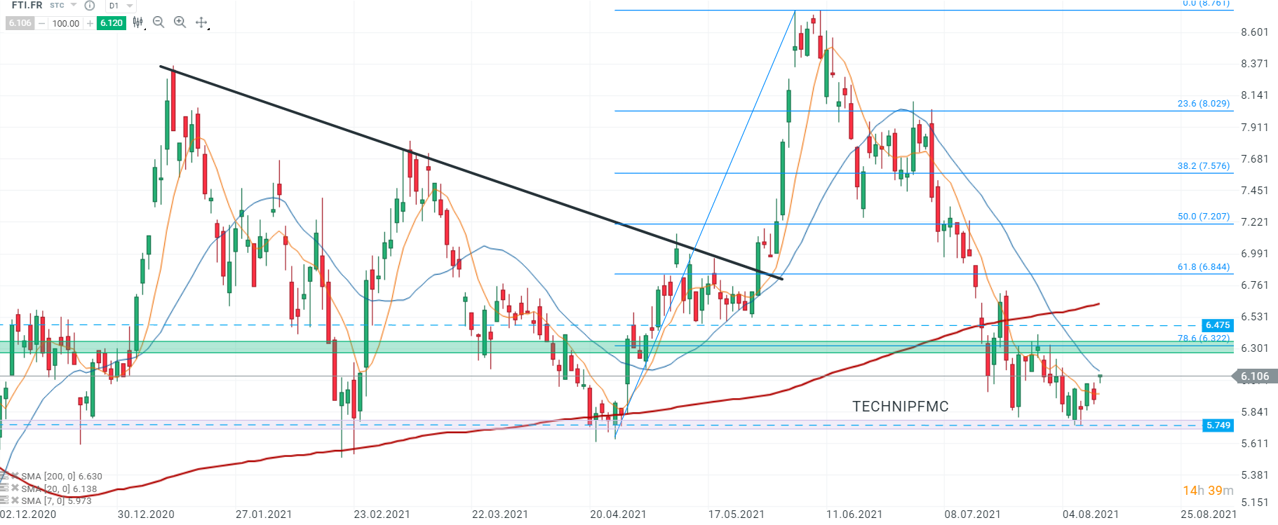 Les cours de Technip FMC (FTI.FR) ont ouvert à la hausse portés par la nouvelle du partenariat. Au moment de la rédaction de ces lignes, les cours se dirigent vers le niveau du retracement de Fibonacci à 78,6% de la hausse entamée le 26/04. En cas de franchissement de ce niveau, le mouvement haussier pourrait s’étendre en direction de la zone de 6,47 qui a servi de support par le passé. Toutefois, si les vendeurs reprennent le contrôle, un retour à la zone de support à 5,75 serait à envisager. Source : xStation5
