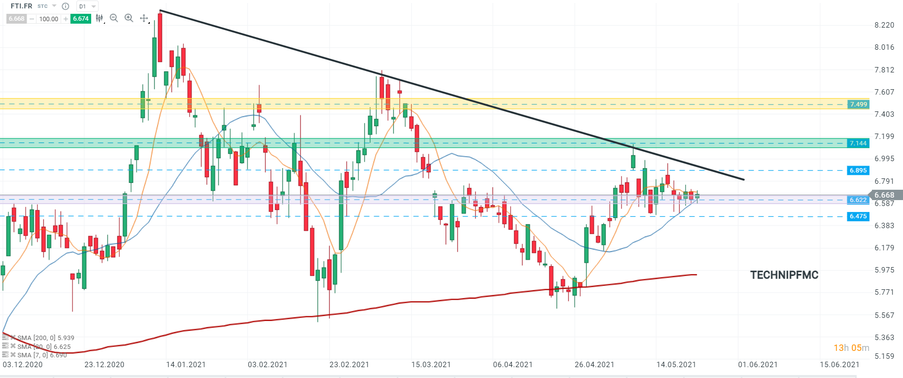 L’action TechnipFMC (FTI.FR) a entamé la session d’aujourd’hui à la hausse, prenant appui sur la zone de support à 6,622 et se dirigeant vers l’oblique haussière à 6,935. Un franchissement de ce niveau donnerait un fort signal d’achat pouvant propulser les cours jusqu’à la résistance à 7,499. Toutefois, si les vendeurs prennent le contrôle, la zone de support à 6,475, constitue la prochaine cible. Source : xStation5