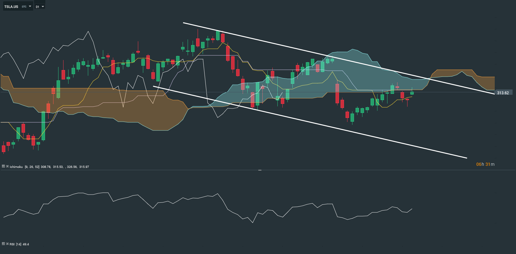 D’un point de vue technique, nous remarquons (en horizon temporel journalier, D1) que l’action est soutenue par la Tenkan (9 périodes) et la Kinjun (26 périodes). Les cours ont franchi la SSB. Il est possible qu’à court terme, le Kumo (nuage bleu) soit franchi. Ainsi, Les cours atteindraient une résistance oblique de long terme. Dans le cas inverse, un franchissement par le haut de la Tenkan et la Kijun entraineraient une baisse de l’action.