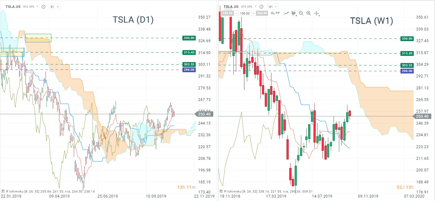 D’un point de vue technique, et au vue du système Ichimoku, Tesla se hisse aux portes de son nuage hebdomadaire, à proximité de sa résistance journalière à 303,50$. Cette résistance constitue le dernier rempart avant les 315,40, extension d’un palier de Kijun journalier (1er rectangle jaune), mais surtout, extension de la SSB hebdomadaire, représentant un seuil majeur du point de vue Ichimoku. Un franchissement de cette dernière serait un signal fort de retour à une tendance haussière de long terme, et pourrait être le vecteur d’une prochaine accélération à la hausse en direction des 330$, représentant un niveau journalier, issu de l’extension d’un palier de SSB. Pour l’heure, Tesla est confronté à de nombreuses résistances dont les 315,40$, et la valeur s’éloigne considérablement de la zone à 236-237$, un support clé qui, en cas de franchissement à la baisse, aurait confirmé une tendance baissière.