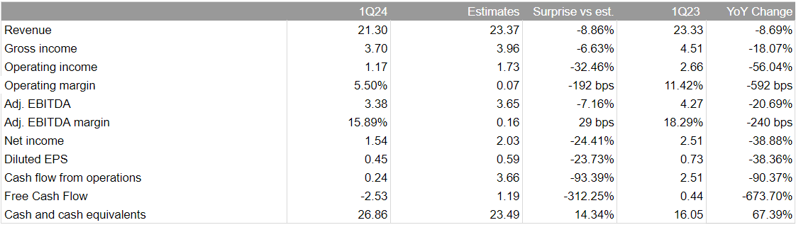 Au niveau du BPA, Tesla a déclaré 1,54 $ (-24,1 % par rapport aux attentes et -39 % en glissement annuel), tandis que le niveau d'EBITDA ajusté a atteint ses valeurs les plus basses depuis le 2T22 et continue la tendance à la baisse depuis mi-2023.