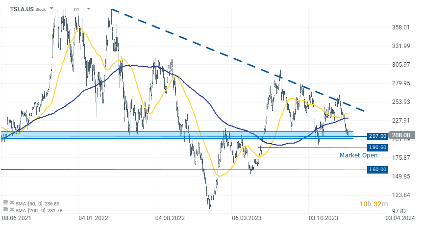 Les actions de Tesla sont déjà en baisse de plus de 8 % dans les échanges pré-marché. L'action a franchi la zone de soutien située autour de 200-207 dollars. Sur la base des cotations actuelles, les actions devraient commencer la séance d'aujourd'hui à environ 190,60 $. Dans la situation actuelle, le prochain support significatif pour le mouvement de baisse pourrait même se situer autour de 160 dollars par action. Les haussiers seront également limités par la résistance au-dessus de 200 dollars.