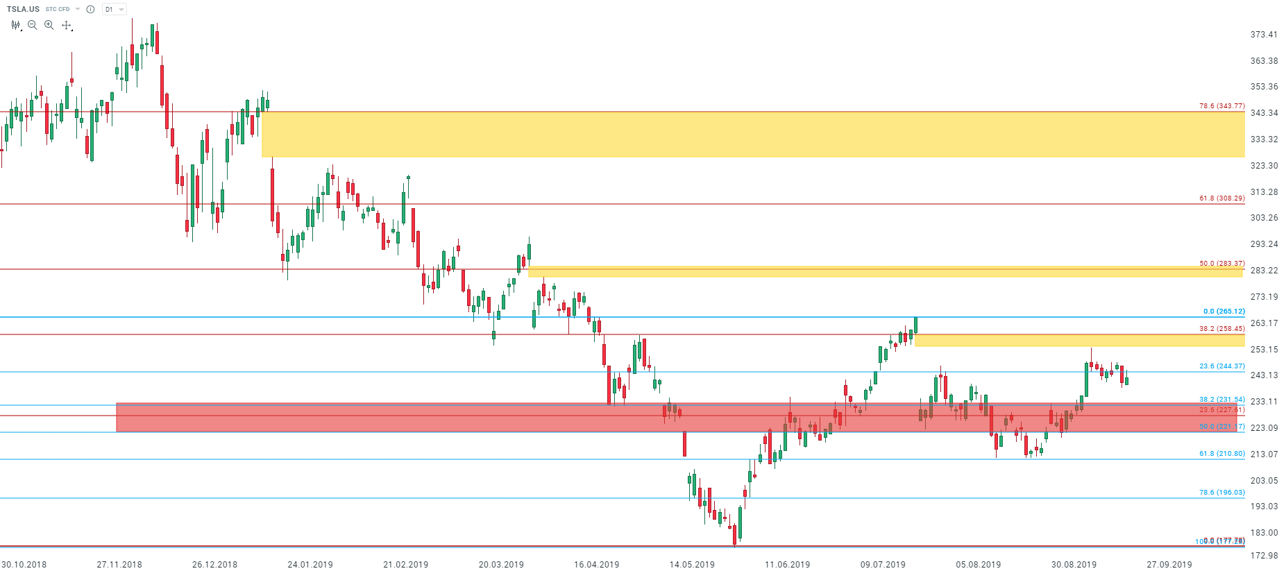 Le titre Tesla (TSLA.US) se maintient au-dessus de sa zone de support majeure matérialisée par le cluster de Fibonacci (zone comprise entre 232 et 221 $). Les cours ne sont toujours pas venus combler le gap baissier du 25 juillet 2018 (suite à la mauvaise publication des résultats du second trimestre 2019). Source : xStation5.