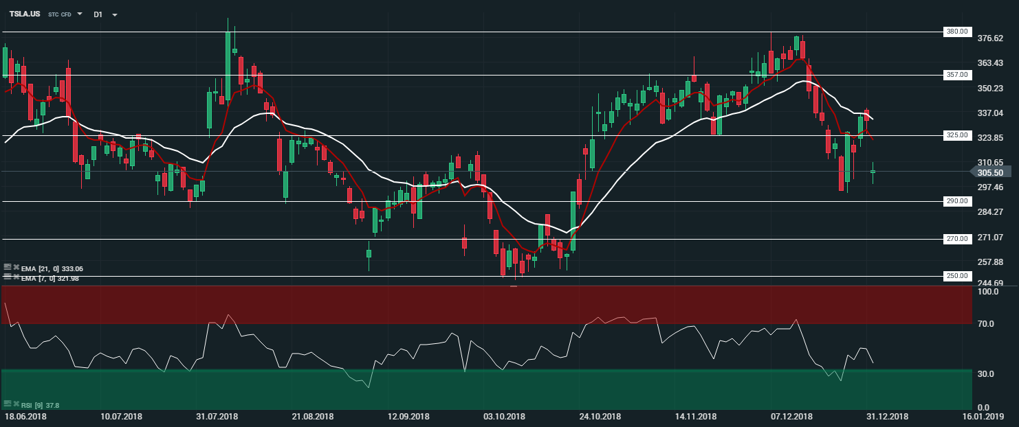 Représentation technique du titre TESLA (TSLA.US) en unité de temps journalière (D1)