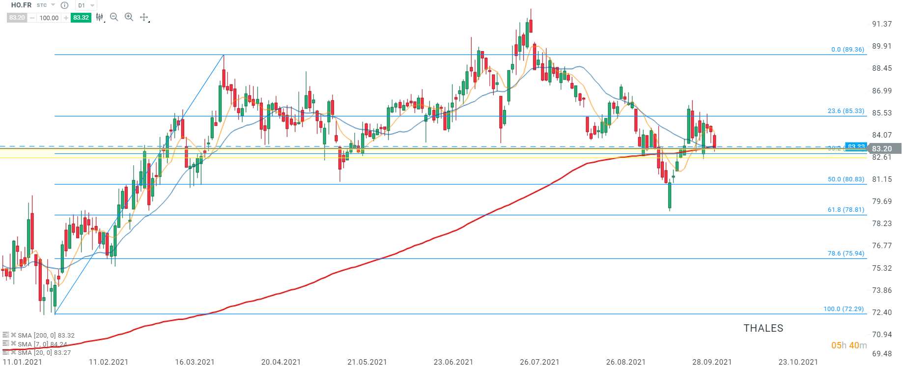 Les cours de Thalès (HO.FR) entament leur troisième séance consécutive en baisse malgré la nouvelle du partenariat avec Google Cloud. Les cours tentent de casser le niveau de retracement de Fibonacci à 38,2% de la hausse entamée le 29/01 au moment de la rédaction de ces lignes. En cas de succès, le mouvement baissier pourrait s’étendre au prochain retracement à 50% (80,83). Si les acheteurs prennent le contrôle, le retracement à 23,6% (85,33) constitue la prochaine cible. Source : xStation5
