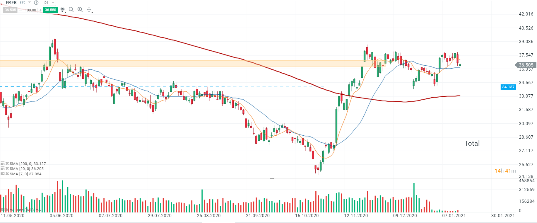 Les cours de Total (FP.FR) ont ouvert avec un léger gap baissier et sont actuellement en plein test de la SMA 20 (ligne bleue). En cas de cassure de ce niveau, le mouvement baissier pourrait s’accélérer vers le creux du 04/01 au niveau des 34,137. Source : xStation5