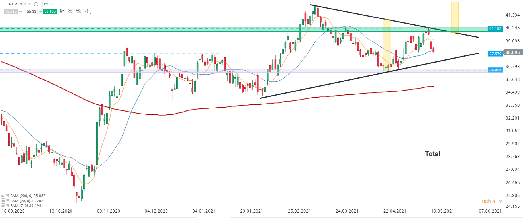 Le titre Total (FP.FR) entame la séance d’aujourd’hui à la hausse, portée par les deux importants contrats remportés en Inde et en Espagne. Les cours évoluent au sein d’une formation en triangle symétrique et tentent de venir combler le gap de la veille au moment de la rédaction de ces lignes. Si le sentiment actuel prévaut, et que le gap mentionné ci-dessus est comblé, le mouvement haussier pourrait se diriger vers la zone coïncidant avec la zone de résistance et la limite supérieure de la formation en triangle. La cassure de cette zone viendrait renforcer les perspectives haussières. Toutefois, si les vendeurs prennent le contrôle, la zone où coïncident la zone de support et la limite inférieure du triangle à 39,496, constitue la prochaine cible. Source : xStation5