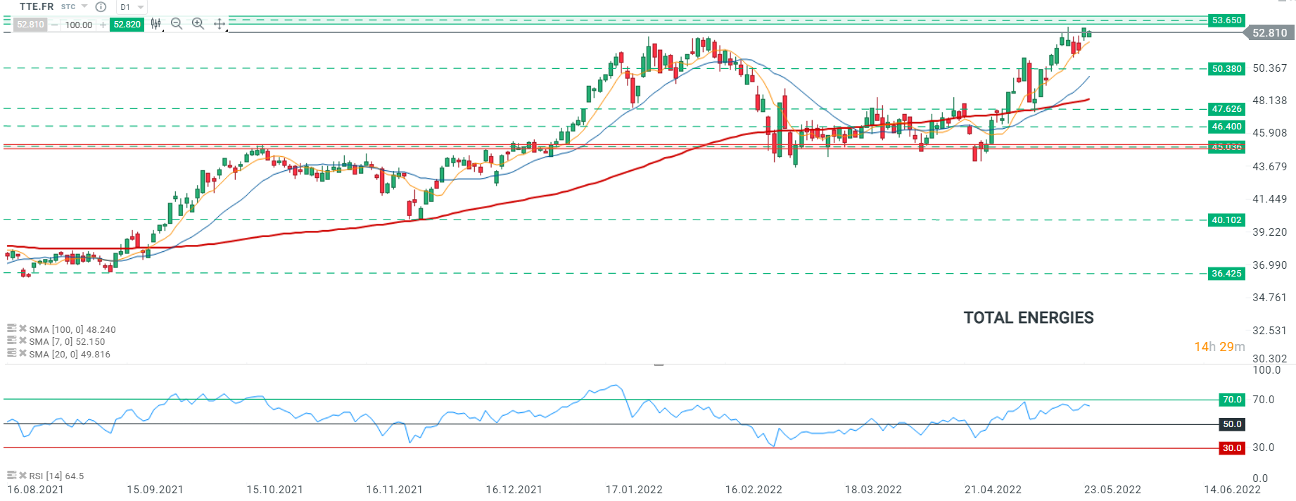 Les cours de Total Energies (TTE.FR) poursuivent leur mouvement haussier entamé fin avril et tentent de franchir la résistance à 53,650 au moment de la rédaction de ces lignes. On remarque d’un point de vue technique que le RSI évolue toujours au-dessus de la zone de neutralité de 50, renforçant ainsi les perspectives haussières sur le titre. Source : xStation5