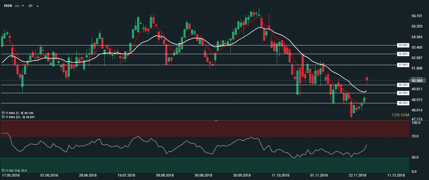 En unité journalière (D1), le titre Total (FP.FR) a ouvert en gap haussier, suite au rebond des cours du pétrole entrepris cette nuit en Asie. Les cours sont à présent portés par les moyennes à 7 et 21 périodes. Le RSI est orienté à la hausse proche de sa zone neutralité et oscille à 53 points. Dans ce contexte, nous avons un biais haussier sur l’actif, avec comme objectif le niveau des 51,90 €.