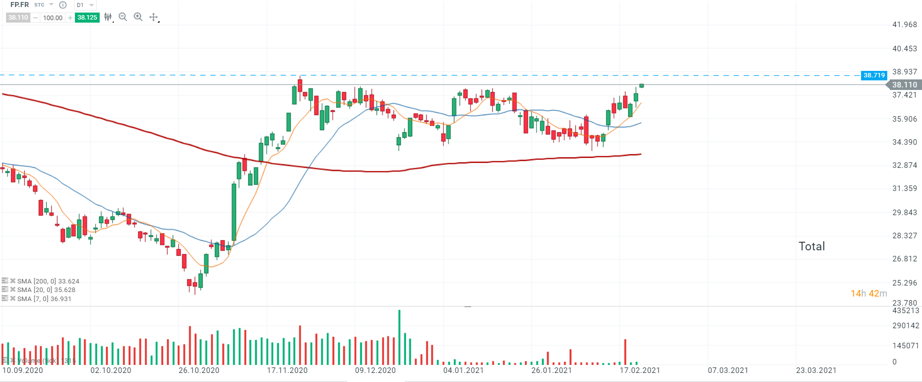 Les cours de Total (FP.FR) ont ouvert avec un léger gap haussier, se dirigeant vers le sommet du 25/11 à 38,719 au moment de la rédaction de ces lignes. En cas de franchissement de ce niveau, le mouvement haussier pourrait s’étendre jusqu’au sommet du 10/06 au niveau des 39,299. Source : xStation5