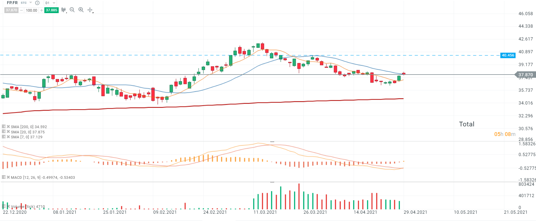 Les cours de Total (FP.FR) ont ouvert à la hausse portés par les résultats encourageants du groupe. Les cours se dirigent vers le niveau de la zone de résistance à 40,456 au moment de la rédaction de ces lignes. Si le sentiment actuel prévaut et en cas de franchissement de ce niveau, les cours pourraient se diriger vers le sommet du 15/03 à 42,288. De plus, la courbe MACD croise à la hausse la courbe Signal, ce qui théoriquement est un signal d’achat. Source : xStation5
