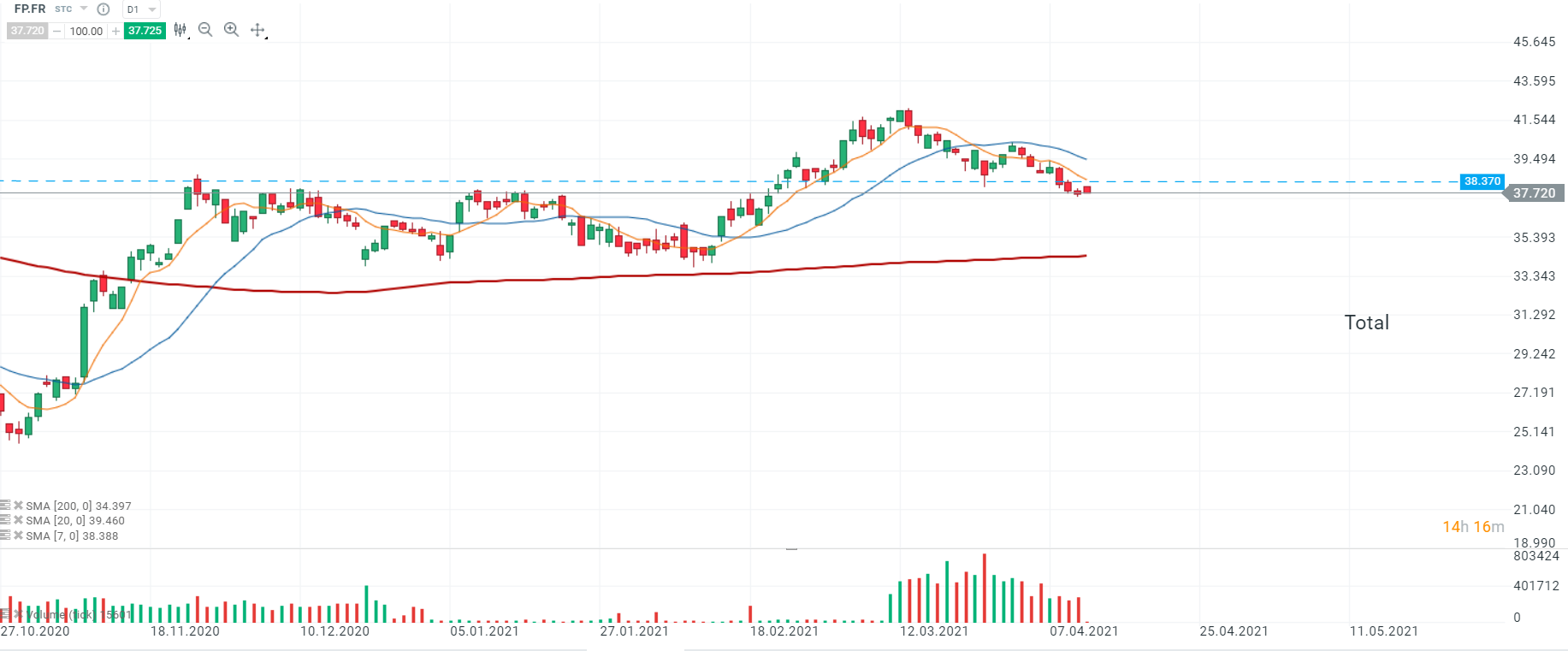 Le titre Total (FP.FR) a gagné près de 10% depuis le début d’année. Aujourd’hui, les cours se dirigent vers la SMA 7 (ligne orange) au niveau des 38,370. Si le sentiment actuel prévaut et que les cours parviennent à franchir ce niveau, une impulsion haussière vers la zone qui coïncide avec la résistance et la SMA 20 (ligne bleue) à 39,565 pourrait être amorcée. Source : xStation5