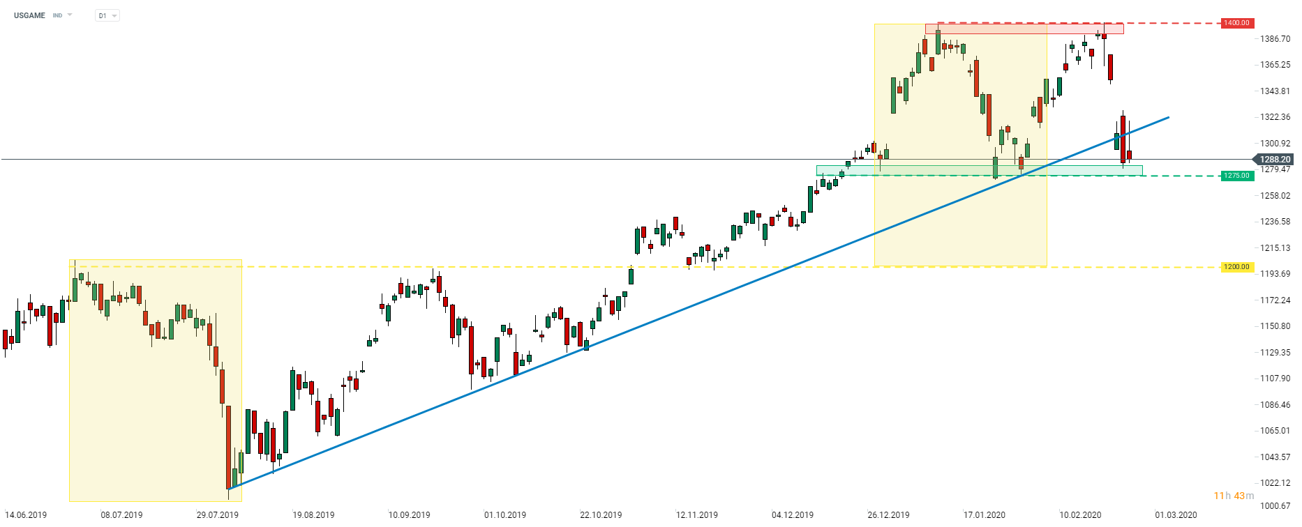 L'indice du secteur des jeux aux États-Unis (USGAME) a glissé d'un sommet historique à 1400 pts et est tombé sous la ligne de tendance à la hausse. Cependant, la baisse a été stoppée au niveau des 1275 pts, qui ont également servi de plancher fin janvier. Hier, l'indice a tenté de revenir au-dessus de la ligne de tendance, mais a échoué. Si le mouvement à la baisse reprend, l'indice pourrait se tourner vers le support final à la limite inférieure de la structure "d'Overbalance" (1200 pts). Cependant, l'objectif potentiel de la structure à double sommet indique une baisse à 1150 pts. Source: xStation5