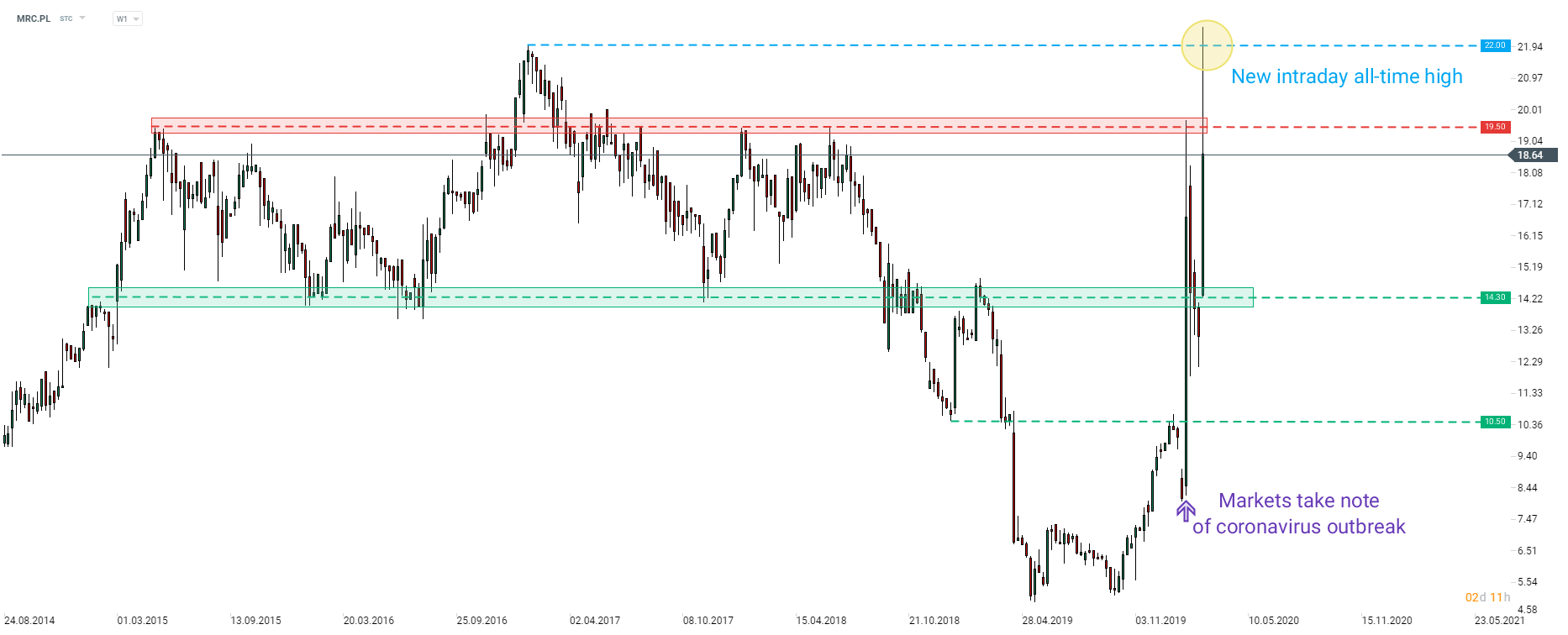 Les actions du fabricant polonais de matériel médical Mercator Medical (MRC.PW) traversent une période importante de leur vie en raison d'une épidémie de coronavirus. Le titre a bondi de plus de 100% depuis le début de l'épidémie et a atteint un nouveau record absolu intrajournalier hier. Un recul peut être observé aujourd'hui, mais les actions de la société pourraient rester soutenues tant que le virus se propagerait. Source: xStation5