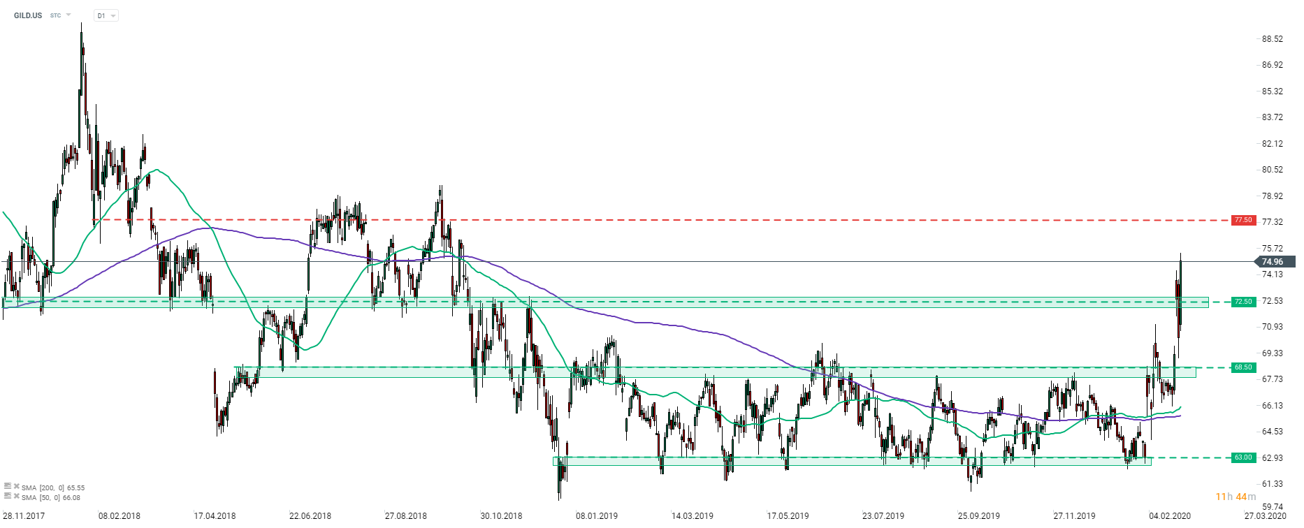 Malgré une forte liquidation sur le marché boursier américain cette semaine, Gilead Science a étendu son gain hebdomadaire à plus de 8% hier. Le médicament développé par la société est actuellement testé pour guérir le nouveau coronavirus. Cependant, il convient de noter que si les tests ne donnent pas de résultats prometteurs, il faudra s'attendre à une inversion du chemin parcouru à la hausse. La zone de support la plus proche se trouve à 72,50 $ et 68,50 $. D'un autre côté, l'action a la possibilité de se rallier de 3% supplémentaires, la résistance la plus proche se situant aux alentours de 77,50 $. Source: xStation5