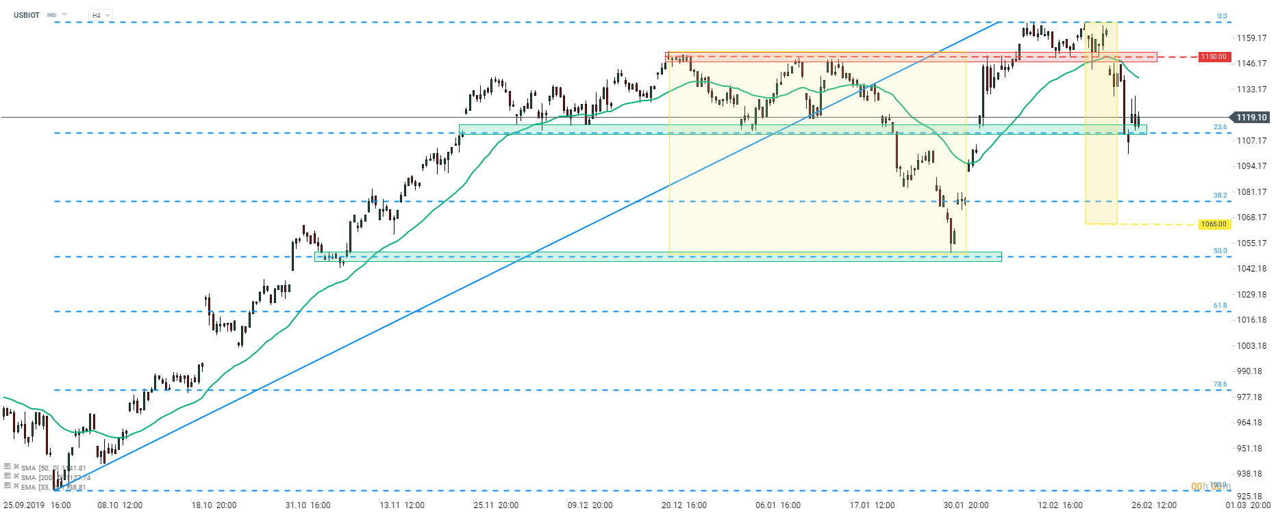 L'indice US Biotech (USBIOT) a dessiné une structure en double sommet près de la zone de 1165 pts avant que le marché directeur ne baisse à cause des problèmes de coronavirus. USBIOT a atteint l'amplitude issue de la projection du pattern baissier et a stoppé la baisse à 23,6%. Le niveau de Fibo de la tendance à la hausse a commencé en octobre 2019. L'indice a chuté de 3,75% cette semaine tandis que le S&P 500 a reculé de 6,6%. L'amplitude de la plus grande correction de l'impulsion ascendante actuelle suggère que la résistance finale peut être trouvée dans la zone 1065 pts. Cependant, dans le cas où un rebond est amorcé, le premier objectif pour les haussiers peut être trouvé au niveau du seuil des 1150 pts. Source: xStation5
