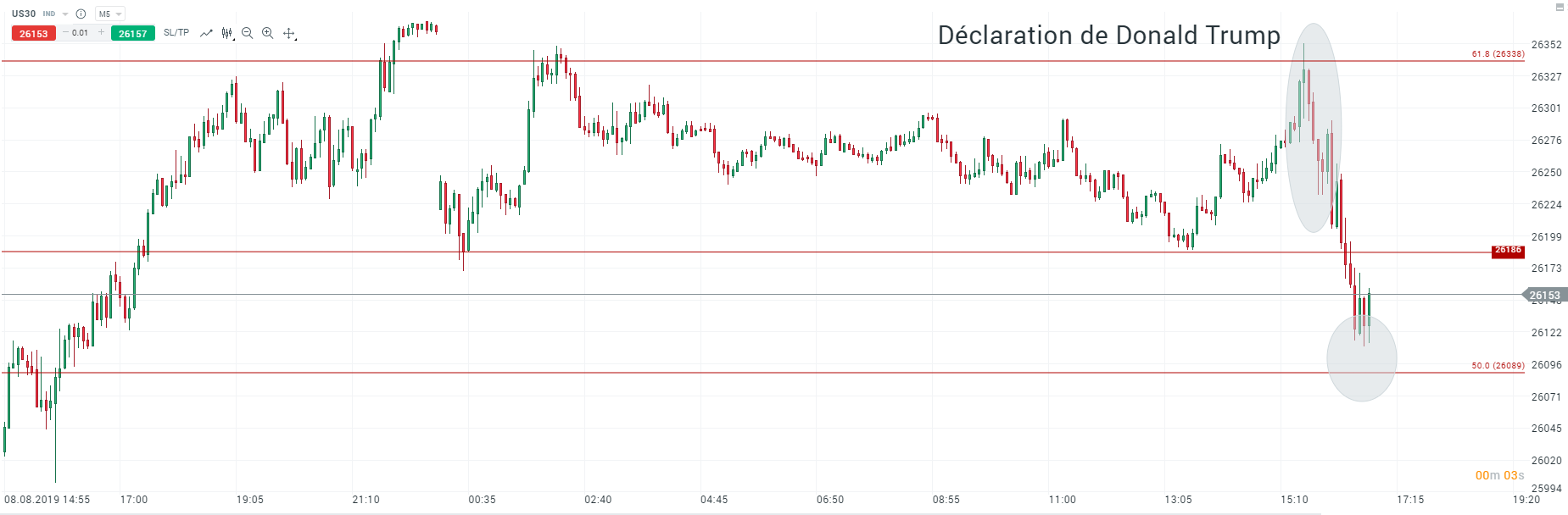 La déclaration de Donald Trump a entrainé un décroche des cours de l’indice Dow Jones. Cependant les cours semblent avoir rebondi sur la zone des 50 % des retracements de Fibonacci. Source : xStation5.