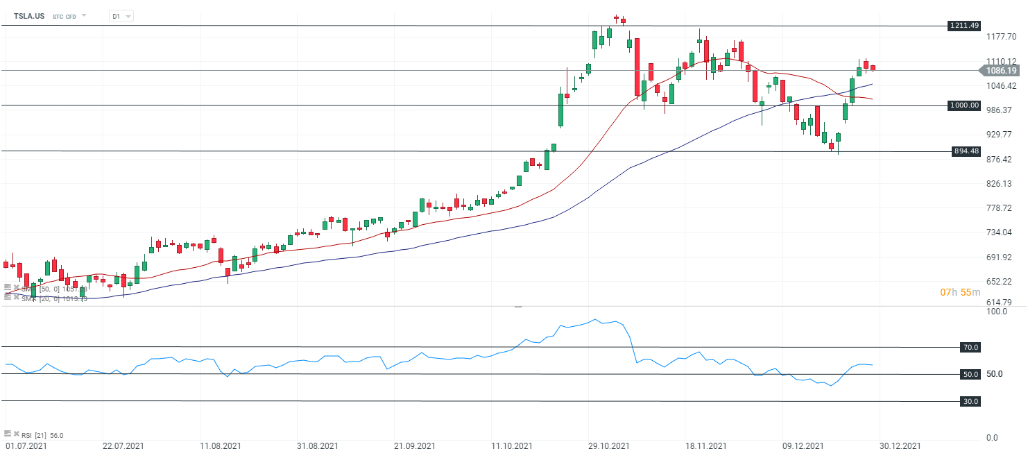 D’un point de vue fondamental, il faut rester à l’affût quant au secteur technologique et à l’action Tesla. Les bilans et comptes de résultats de Tesla seront publiés au mois de Février. D’après les analystes, et malgré le contexte sanitaire connu en 2021, l’action Tesla accroîtrait son bénéfice et son bilan serait meilleur que celui de 2020. L’information est à prendre avec des pincettes car, même si l’entreprise vient à amener des signes positifs d’un point de vue financier, son PER reste très élevé, suggérant que l’action est surévaluée par rapport à son secteur, une correction baissière pourrait donc voir le jour en 2022. Tant que les éléments techniques tiennent, la tendance reste cependant haussière.