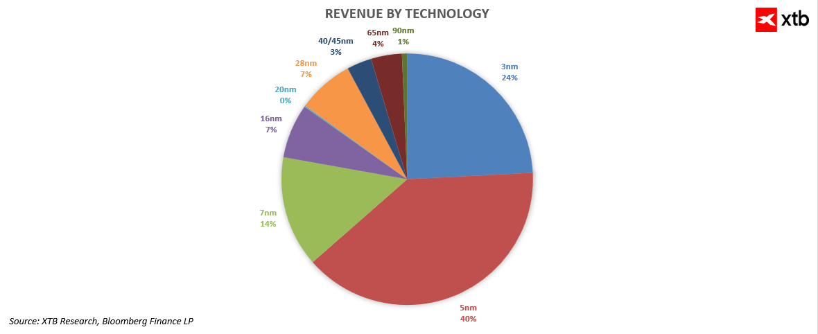 Les procédés 3nm, 5nm et 7nm représentent 77% des revenus wafers, montrant une forte concentration sur les technologies de pointe.