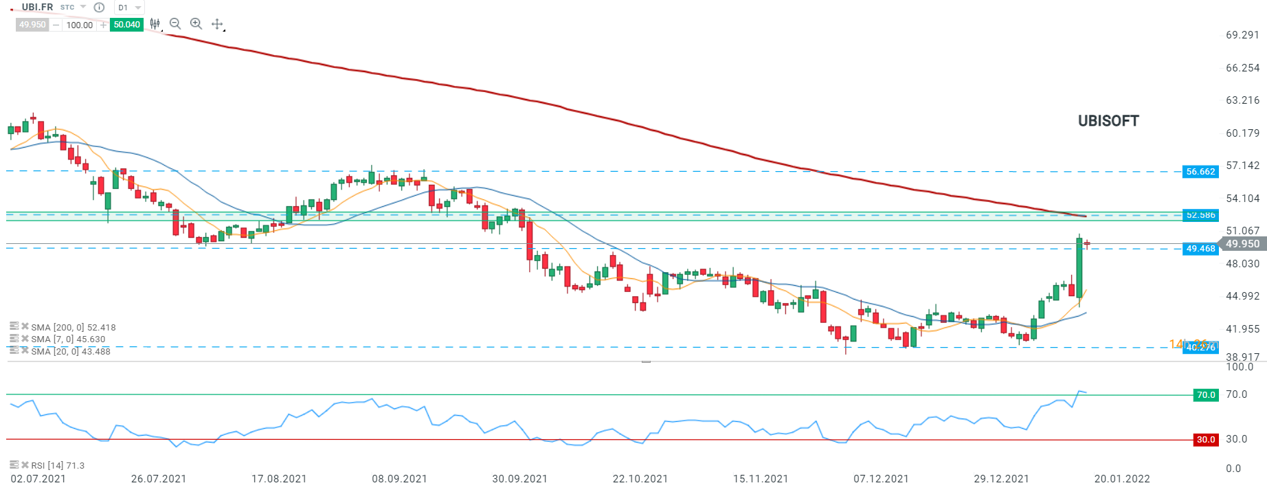 Les cours d’Ubisoft (UBI.FR) ont ouvert en légère baisse aujourd’hui après avoir progressé hier de près de 12% suite à l’annonce de l’acquisition d’Activision par Microsoft. Les cours tentent de se hisser jusqu’au niveau de la SMA 200 (ligne rouge) en prenant appui sur le support à 49,468. Toutefois, si les cours cassent le support susmentionné, un retour au support de 44,832 ne peut être exclu. De plus, le RSI est supérieur à 70 et donc en zone de surachat ce qui signifie que le titre est sujet à une correction baissière. Source : xStation5