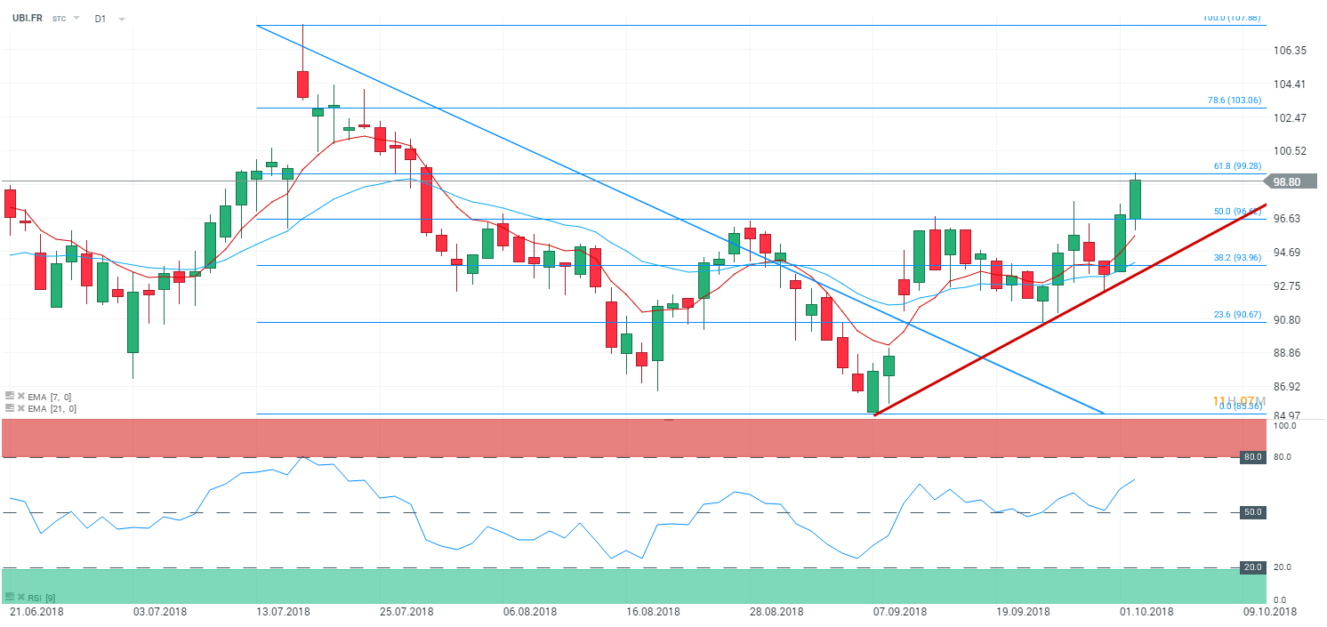 Aujourd’hui est une date importante pour Ubisoft (UBI.FR) – à double titre : Premièrement, c’est la sortie officiel de son jeu vidéo phare « Assassin’s Creed » très bien accueilli par les critiques. Deuxièmement, la société a annoncé un partenariat avec Google concernant le service de jeux vidéo à la demande. Il n’en fallait pas moins pour que le titre gagne +2,44 % et s’échange à 99,16 € sont plus haut niveau depuis 2 mois. Ce titre avait déjà fait l’objet d’une recommandation d’achat mi-septembre par JPMorgan qui fixe un objectif de cours à 130 €. L’entreprise ne s’est jamais caché de vouloir challenger les géants américains du secteur tel que Electronic Arts– lire notre analyse sur cette valeur ici.