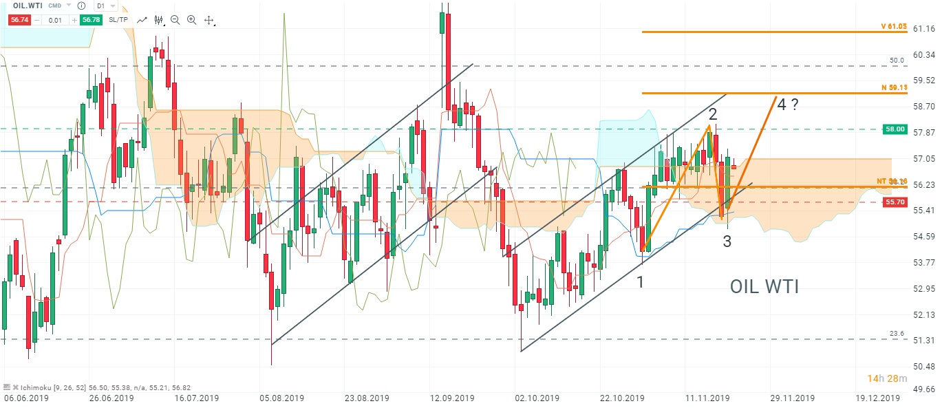 D’un point de vue technique, le pétrole WTI a réintégré hier son canal haussier, propulsé à la hausse par une augmentation des stocks hebdomadaires de brut aux Etats-Unis moins prononcée que les anticipations. Ce facteur haussier a été amplifié après que les Houthis (« rebelles » yéménites) aient annoncé avoir abattu un avion de la coalition saoudienne. D’un point de vue technique, la Kijun a soutenu les cours avant la réintégration dans le canal, mettant ainsi fin à la vague de correction (vague 2-3) entamée le 18 novembre. Cette nouvelle vague impulsive se confirme suite à une sortie de nuage, indiquant un signal d’achat en cours de confirmation par la lagging-span, actuellement confrontée à la Kijun. Si la vague impulsive en cours de formation parvient à franchir le sommet de la précédente vague (1-2) à 58$, le mouvement devrait se prolonger avec pour premier objectif les 59,10$. Pour l’heure, si le signal Ichimoku est validé par la Lagging-span, l’objectif est donc à 58$. En revanche, tout franchissement à la baisse des 56,12$, invaliderait la vague impulsive (3-4) et renverrait les cours du pétrole vers la KIjun à 55,40$.