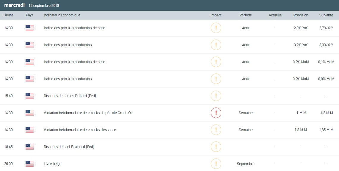 Les indices européens ont ouvert sur une note positive après une séance asiatique plus que tumultueuse. Le DAX 30 (DE30) fluctue autour des 12 000 points, en hausse de 0,3 %. Pour aujourd’hui, nous prendrons connaissance de l’évolution de la production industrielle en zone euro au titre du mois de juillet. Aux Etats-Unis, nous nous intéresserons aux prix à la production du mois d’août et le « Beige Book » de la Réserve fédérale (Fed). Sur le front pétrolier, nous assisterons à la publication du rapport mensuel de l’OPEP et des stocks hebdomadaires de pétrole américains. Du côté des entreprises, l’attention des opérateurs se concentrera sur Apple qui doit présenter de nouveaux iPhones et d’autres produits.