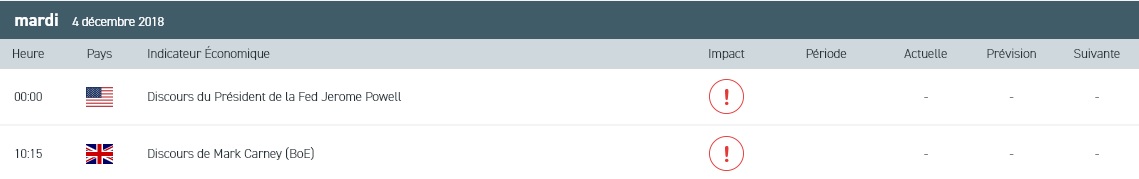 Entre trêve commerciale en trompe-l’œil et inversion de la courbe des taux US, les opérateurs auront du pain sur la planche ce mardi. Sans grande surprise, les indices européens ont ouvert en territoire négatif dans le sillage des places asiatiques. Contrairement à la séance de la veille, le calendrier économique du jour sera peu fourni en données macroéconomiques. En effet, nous nous intéresserons au discours de Mark Carney, gouverneur de la Banque d’Angleterre (BoE) et à la publication de l’indice PMI du secteur de la construction du mois de novembre au Royaume-Uni. Du côté de la zone euro, cette matinée sera dominée par la parution de l’indice des prix à la production au titre du mois d’octobre. Enfin, au Japon, l’indice NIKKEI 225 a terminé la séance en baisse de 2,39 % à 22 036,05 points en raison d’importants dégagements sur les valeurs exportatrices, financières et cycliques.