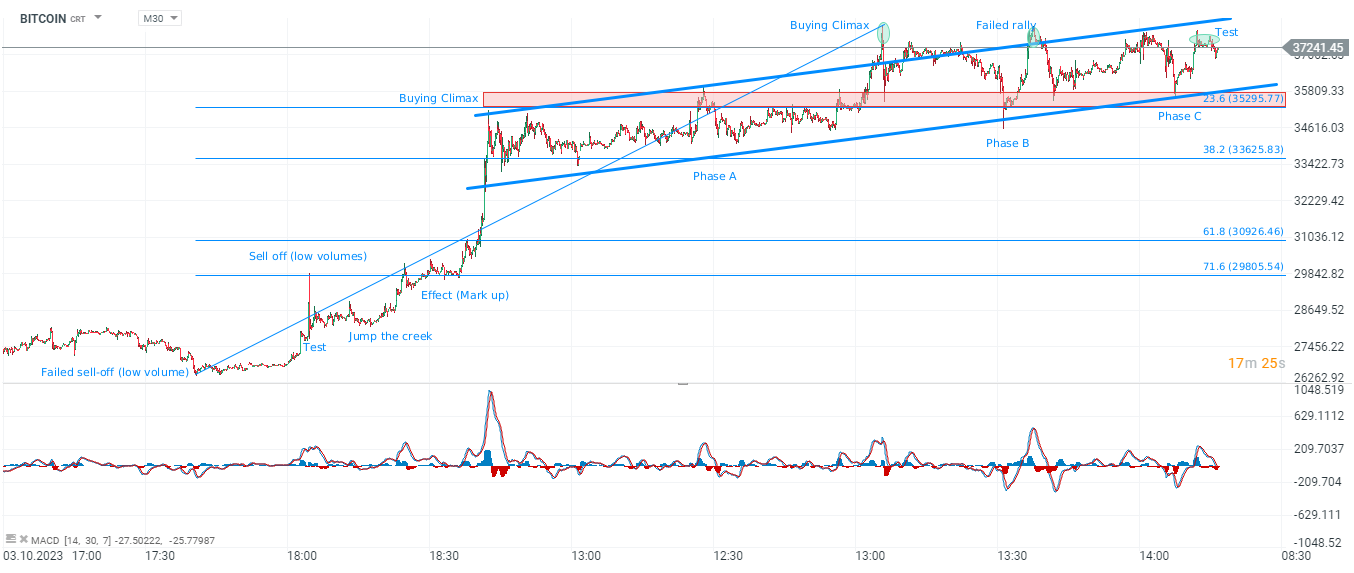 Si l'on examine le cours du bitcoin lui-même, sur l'intervalle M30, on constate que la plus importante des crypto-monnaies se trouve désormais potentiellement dans une configuration de distribution baissière de Wyckoff. L'offre s'est déclenchée trois fois après des reprises ratées vers 38 000 $, ce qui a mis un frein à la reprise en volume, et potentiellement. Une zone clé pour arrêter la pression à la baisse pourrait être 35 000 $, où nous voyons le retracement de 23,6 Fibonacci de la vague ascendante d'octobre, et potentiellement un emplacement clé pour l'ensemble de la distribution de Wyckoff. Une chute en dessous de ce niveau pourrait potentiellement annoncer un sell-off et déclencher la liquidation des positions longues. D'un autre côté, un rallye au-dessus de 38 000 $ pourrait indiquer que la distribution a échoué et ouvrir la voie à la résistance psychologiquement importante de 40 000 $.