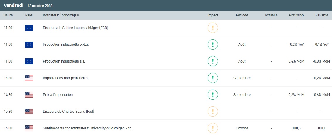Après plusieurs séances en territoire négatif, les indices européens ont ouvert en territoire positif dans le sillage de l’euro et des marchés asiatiques. Concernant le calendrier économique de ce vendredi, nous prendrons connaissance des ventes au détail et de la production industrielle au titre du mois d’août en zone euro. Aux Etats-Unis, nous nous intéresserons à l’indice des prix à l’exportation et à l’importation au titre du mois de septembre ainsi qu’à la première estimation de l’indice Reuters-Université du Michigan de confiance du consommateur pour le mois d’octobre. En outre, la dernière séance de la semaine sera dominée par de début de la saison des résultats du troisième trimestre avec les publications de Delta Air Lines, JP Morgan Chase, Wells Fargo et de Citigroup. Décryptage.