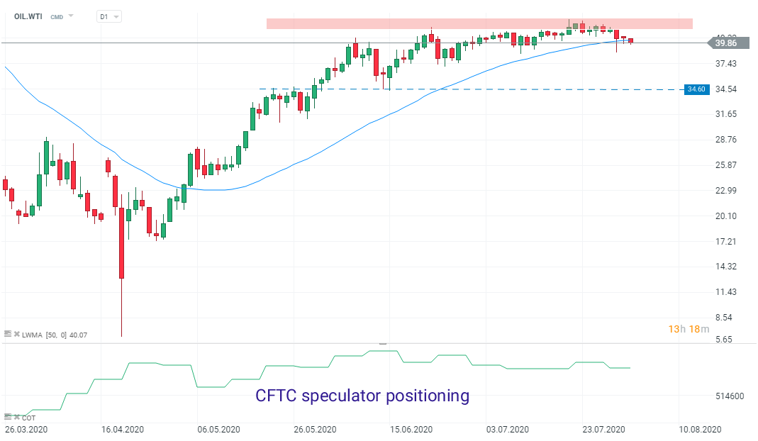 OIL.WTI est en baisse pour le troisième jour consécutif. La baisse n'a pas été brutale jusqu'à présent, mais elle pourrait mettre fin à une période de consolidation des prix. Le pétrole n'a pas pu profiter de l'environnement de prise de risque et de la faiblesse du billet vert, car on craint que la reprise de la pandémie n'entrave la reprise de la demande. Le mois d'août marque un certain assouplissement de l'accord OPEP+, ce qui, techniquement, pourrait augmenter la production de 2 mbds (plus de 2 % du total mondial). Au cas où la correction aurait lieu, les opérateurs devraient prêter attention au niveau de 34,60 dollars comme support potentiel.