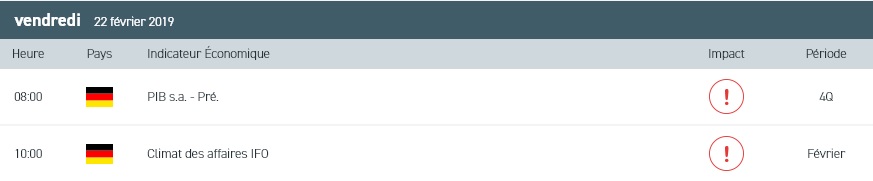 Les marchés sont rattrapés par la détérioration des perspectives économiques mondiales. Bien sûr, le ralentissement marqué des indices d’activité en Europe et aux Etats-Unis est de nature à contrecarrer les avancées commerciales sino-américaines et le ton accommodant de la Réserve fédérale. Pour aujourd’hui, on s’intéressera à la publication de l’indice Ifo du climat des affaires en Allemagne et à l’indice des prix à la consommation du mois de janvier en zone euro. Du côté de l’outre-Atlantique, la session boursière sera dominée par la publication des ventes au détail du mois décembre au Canada et de l’indice d’activité pétrolière Baker Hughes. Par ailleurs, la séance du jour sera animée par les résultats d’Edenred, Pearson, Sopra Steria et de Sika.