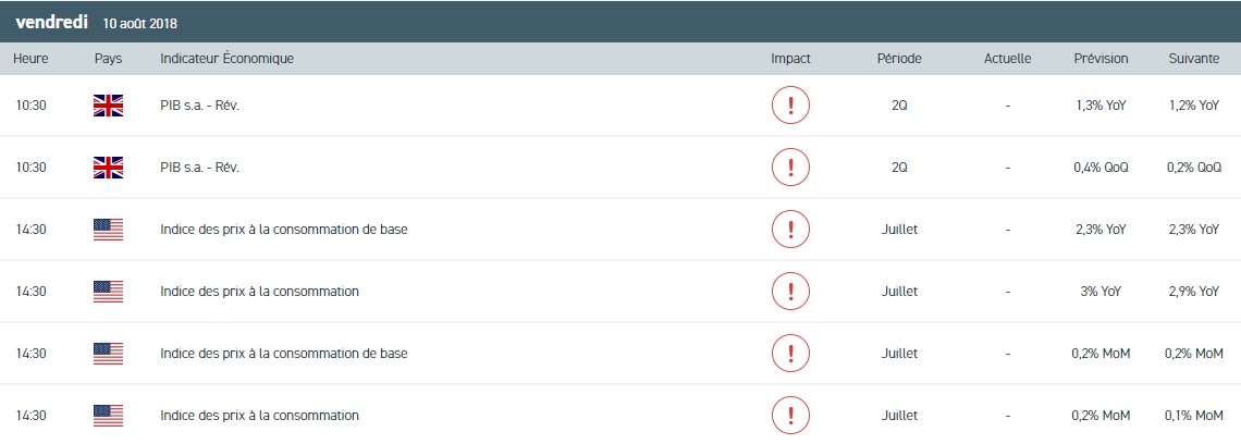 Comme évoqué en introduction, les marchés seront focalisés sur la publication des chiffres de l’inflation (indice des prix à la consommation) du mois de juillet aux Etats-Unis. Pour l’heure, le consensus anticipe une hausse de 0,2 % et de 3 % en rythme annualisé. Les opérateurs ont pris connaissance jeudi de l’indice des prix à la production, qui est resté stable au mois de juillet. Toutefois, l’indicateur avancé d’inflation enregistre une hausse de 3,3 % sur un an. Dans le même temps, les inscriptions hebdomadaires au chômage ont diminué de 6 000 inscriptions à 213 000. En dépit de ces statistiques, le Dow Jones et le S&P500 ont terminé en baisse en raison de la contraction des prix du pétrole et des craintes d’escalade commerciale entre la Chine et les Etats-Unis.