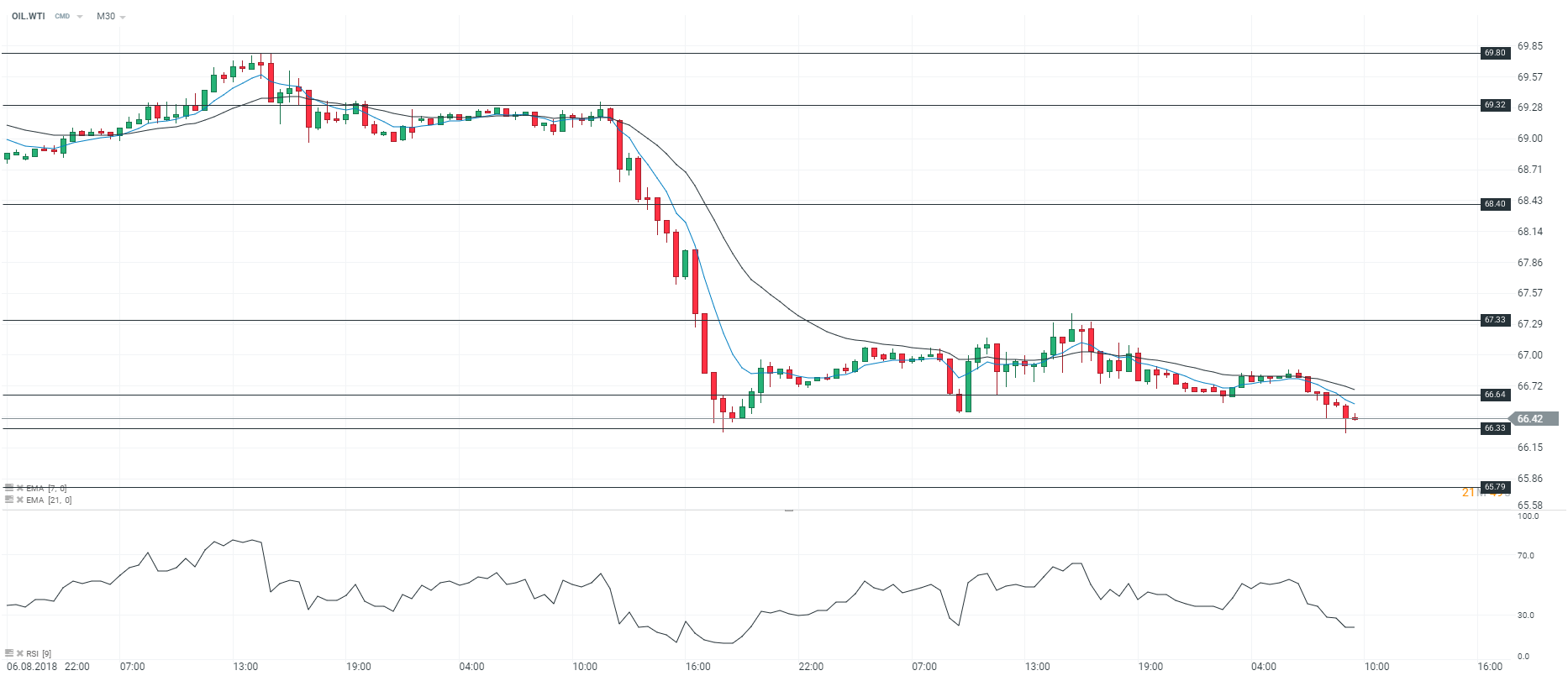 Sur le front des matières premières, les prix du pétrole ont terminé en baisse en raison des inquiétudes relatives à une baisse de la demande dans un contexte de guerre commerciale. En outre, le marché est perturbé par la faible contraction des stocks de pétrole aux Etats-Unis. En effet, selon le département de l’Energie américain (DoE), les stocks de brut ont reculé de 1,35 million de barils la semaine dernière. Sur le plan technique, la toile de fond est baissière en unité de temps 30 minutes sur le contrat WTI. Et pour cause, les prix fluctuent désormais sous les moyennes mobiles à 7 et 21 périodes. Dans un tel contexte, nous avons un biais vendeur sur l’actif et estimons que les prix devraient rallier le niveau des 65,8 $ le baril.