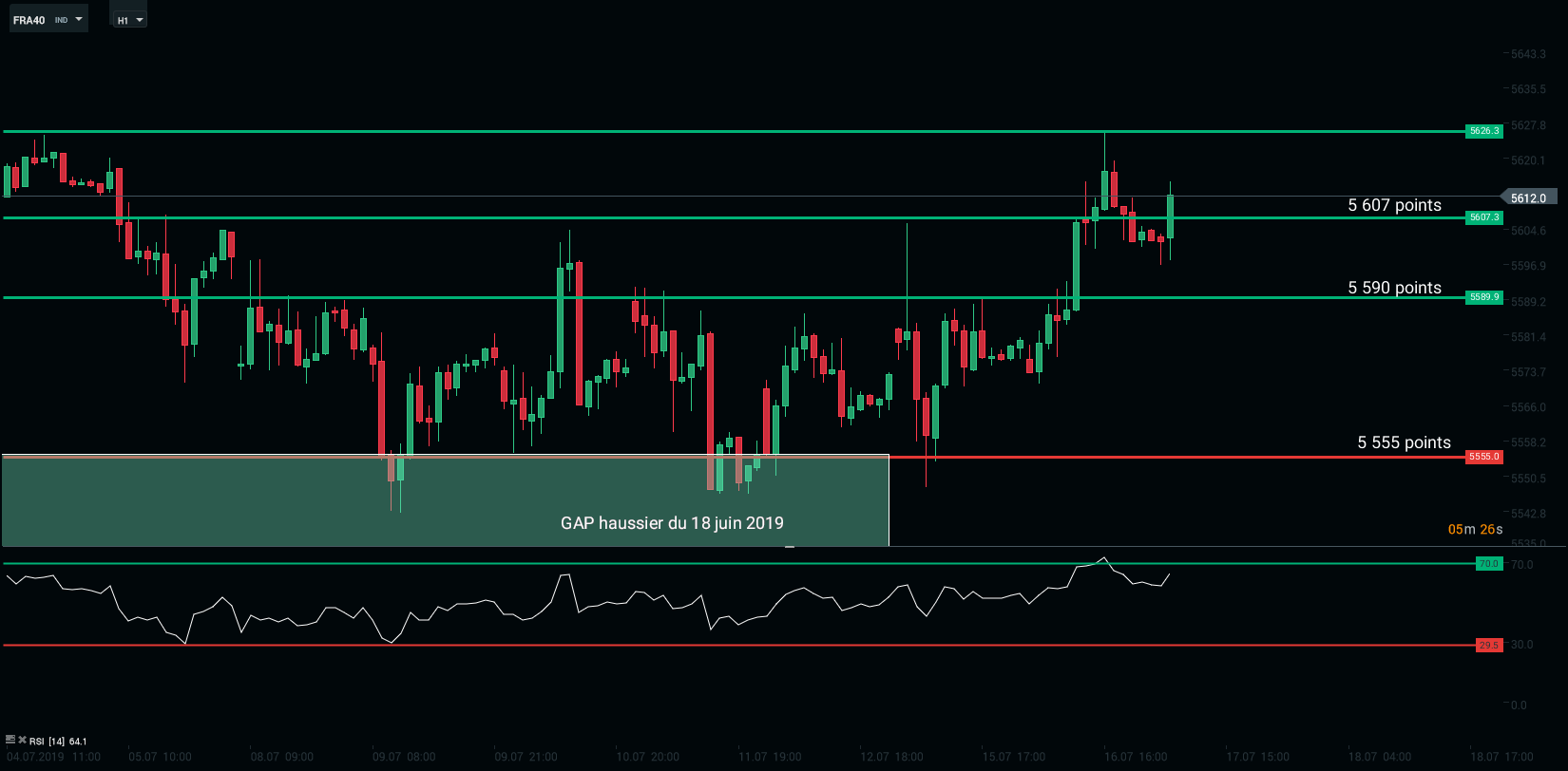 Aujourd’hui, les marchés actions ont ouvert en léger recul. Le CAC40 cède 0,09 %, mais parvient à survoler le seuil des 5 600 points. A croire que les propos de J.Powell sont passés inaperçus. Pourtant dans la soirée de mardi, le président de la Réserve a réaffirmé la volonté de la banque d’émission à agir "de manière appropriée" afin de soutenir l'économie des Etats-Unis. La baisse des taux durant la réunion du 31 juillet est déjà actée. La saison des résultats pourrait être le moteur d’une nouvelle hausse des marchés. Toutefois, une réponse de Pékin aux provocations de Washington serait catastrophique pour les marchés actions.