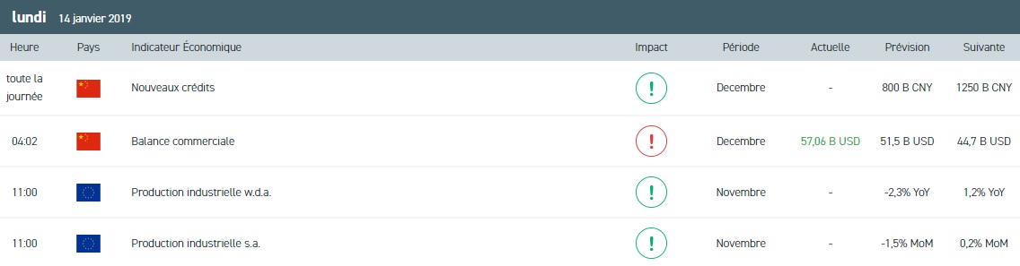 Les indices européens perdent du terrain après la publication des chiffres du commerce extérieur en Chine. Les chiffres des importations et exportations se sont respectivement contractés de 7,6 et 4,4 % au mois de décembre. Outre le vote sur le « Brexit », on s’intéressera cette semaine aux résultats d’entreprises. En effet, les investisseurs prendront connaissance ce lundi de la publication des comptes de Citigroup. Par ailleurs, le calendrier économique du jour sera peu fourni en donnée macroéconomique. Nous nous focaliserons seulement sur la production industrielle du mois de novembre en zone euro. Enfin, l’indice CSI 300 a terminé en baisse de 0,87 % à 3 067,78 points et l’indice Hang Seng a clôturé en repli de 1,38 % à 26 298,33 points.