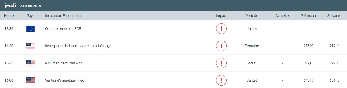 Les marchés européens sont en territoire positif ce jeudi dans le sillage des indices chinois. La toile de fond technique est relativement saine avant la parution des « Minutes » de la Banque centrale européenne (BCE). Concernant le calendrier économique du jour, nous prendrons connaissance des indices PMI manufacturier et des services en Allemagne et en zone euro. Du côté des Etats-Unis, nous assisterons au début du symposium économique de Jackson Hole (Wyoming – Etats-Unis) qui se déroulera du 23 au 25 août. Outre les discours des principaux banquiers centraux (J.Powell, H.Kuroda et M.Draghi), nous nous intéresserons à l’évolution des politiques monétaires dans un contexte politique et commercial relativement instable.