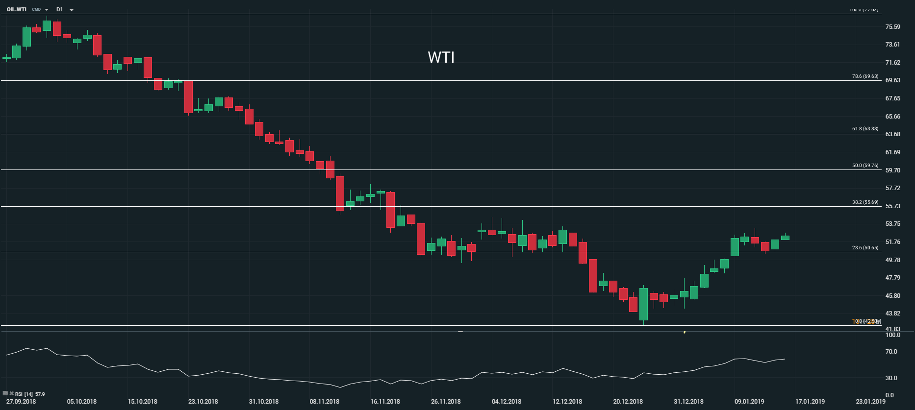 Représentation technique du contrat WTI, en D1