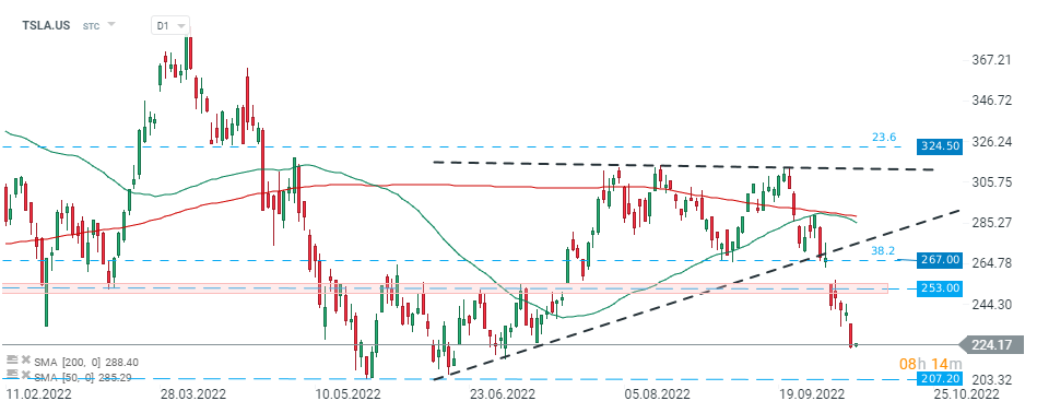 L'action Tesla (TSLA.US) a fortement chuté la semaine dernière après que les acheteurs n'ont pas réussi à dépasser la résistance locale à 253,00 $. Tant que le sentiment actuel prévaut, le mouvement à la baisse pourrait s'approfondir vers les creux de juin autour de 207,20 $. Source : xStation5