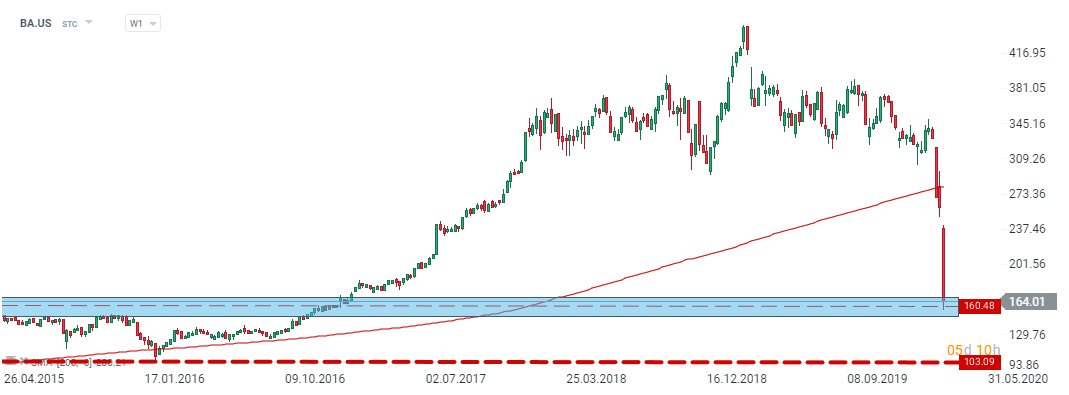 Boeing (BA.US) – Le cours de l'action a baissé la semaine dernière et teste actuellement un support solide à 160,48 $. Si le cours se déplace en dessous de ce niveau, il peut continuer à descendre vers le prochain niveau de support à 103,09 $. Source: xStation5