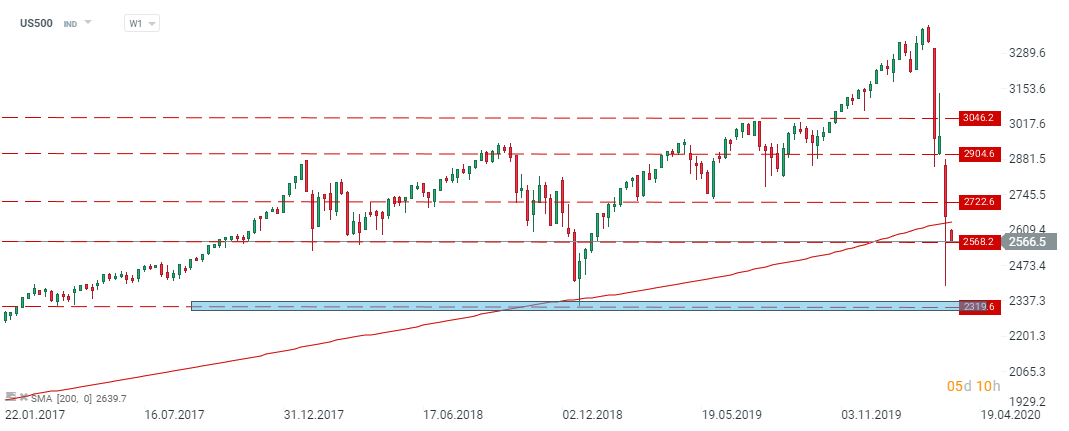 Le S&P 500 (US500) a trouvé un support au niveau de 2568,2 pts que nous avons défini précédemment. Cependant, si le résultat de la conférence sera décevant alors, ce niveau de support peut se rompre très rapidement et l'indice pourrait retester le niveau de 2319,6 pts. Source: xStation5