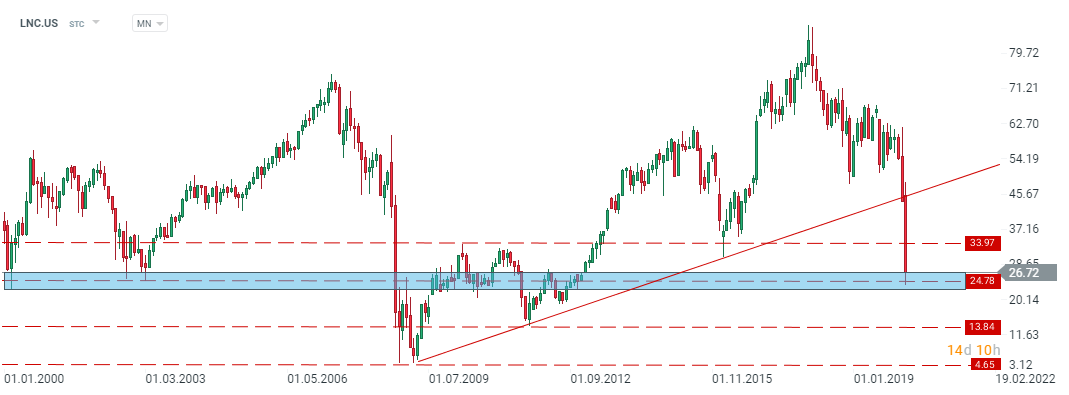 Le cours de l'action de Lincoln National Corporation (LNC.US) teste le support clé à 24,78 $. Si un sentiment négatif persiste sur les marchés, lecours pourrait tester le prochain niveau de support situé à 13,84 $. Source: xStation5