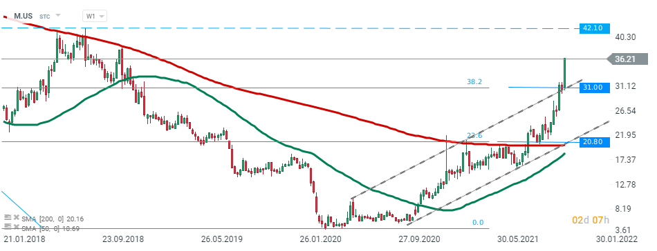 L'action Macy's (M.US) a franchi la résistance majeure de 31,00 $ qui coïncide avec la limite supérieure du canal ascendant et le retracement de Fibonacci à 38,2% du mouvement baissier amorcé en juillet 2015. Tant que le cours reste au-dessus, la poursuite de la hausse est le scénario le plus probable. Le prochain objectif pour les acheteurs se situe à 42,10 $. D'autre part, si les vendeurs parviennent à reprendre le contrôle, alors un autre mouvement baissier pourrait s'accélérer vers le support à 20,80 $. Source : xStation5