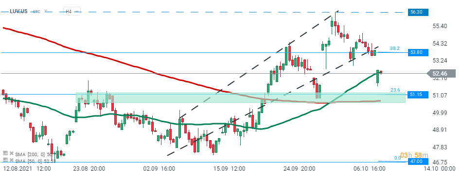 L'action Southwest Airlines (LUV.US) a entamé aujourd'hui en forte baisse, sous la limite inférieure de la formation en biseau et la SMA 50 (ligne verte). Si le sentiment actuel prévaut, le mouvement de baisse pourrait s'étendre jusqu'au support de 51,15 $, qui coïncide avec le retracement de Fibonacci à 23,6 % de la dernière vague de baisse et la SMA 200 (ligne rouge), voire jusqu'au niveau de 47,00 $, où se trouvent les creux du mois d'août. Source : xStation5