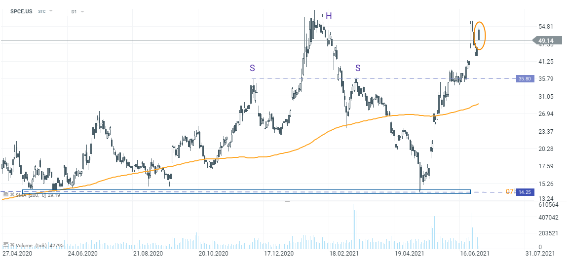L'action de Virgin Galactic (SPCE.US) s'envole après l'annonce du prochain vol d'essai. Même si l'on peut observer une certaine prise de bénéfices, les actions continuent d'augmenter d'environ 15 %. Ces derniers jours, le prix a dépassé la zone de 35,80 $ - un niveau important compte tenu de la configuration précédente den épaule-tête-épaule. Bien que les acheteurs puissent viser à atteindre les sommets de février (résistance majeure pour l'instant), le niveau mentionné de 35,80 $ devrait être le niveau de support critique. Source : xStation5