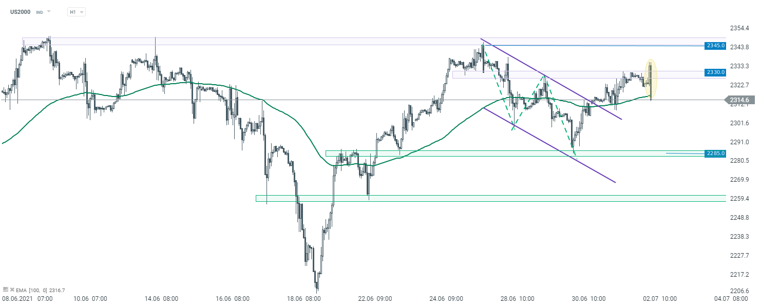 Le Russell 2000 (US2000) est à la traîne de ses pairs au cours de la séance américaine d'aujourd'hui - l'indice des petites capitalisations se négocie à la baisse alors que les autres grands indices américains sont en hausse. L'indice a franchi la zone de résistance à 2 330 pts aujourd'hui, mais s'est replié peu après. Le prix teste actuellement l'EMA-100 - s'il tombe en dessous de la moyenne mobile, le mouvement de baisse pourrait potentiellement s'accélérer. Source : xStation5